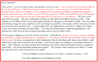 An 1887 letter of William Tecumseh Sherman indicates that he was being targeted by Union Army hero, journalist and Congressional Medal of Honor winner, Henry Van Ness Boynton, mentioning also the daughters of Morgan Lewis Smith and his widow's claim that something was owed her relative to the U.S. Postal Service, perhaps like Elizabeth Van Lew, the Union spy in Richmond who received a U.S. Postal Service "star route." Amazingly, Sherman references Confederate General Braxton Bragg who was, in Sherman's mind, to have already handled widow Morgan's claim long after the war!" said Wigglesworth, but equally informative of Sherman's role is his reference to Corkhill. Who was Corkhill? Ah.....that's important not to miss his significant connection to the camel caravan, but from his catbird seat in Washington. He was editor of the Washington Chronicle and friend of the founder of the Washington Post, Stilson Hutchins," said Wigglesworth.